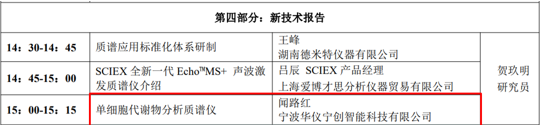 3月22日,會議報告如期召開。寧波大學教授、華儀寧創總經理聞路紅受邀出席新技術報告會議,并在現場作《單細胞代謝物分析質譜儀》主題報告。聞路紅教授在報告中向現場觀眾詳細介紹了華儀寧創基于原創質譜技術研發推出的國產單細胞質譜儀SinCell-100,并在后續報告中圍繞單細胞質譜儀的主要應用領域以及目前已突破的關鍵技術點進行講解。報告最后,聞路紅教授針對現場觀眾所提出的問題逐一進行解答,報告現場反響異常熱烈。