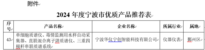 近日,寧波市經(jīng)濟(jì)和信息化局正式公布了《2024年度寧波市優(yōu)質(zhì)產(chǎn)品推薦目錄》,華儀寧創(chuàng)自主研發(fā)的單細(xì)胞質(zhì)譜儀、毒情監(jiān)測用水樣自動(dòng)采集器、直聯(lián)混合離子阱質(zhì)譜儀、三重四極桿串聯(lián)質(zhì)譜系統(tǒng)成功入選。據(jù)悉,列入寧波市優(yōu)質(zhì)產(chǎn)品推薦目錄的企業(yè)產(chǎn)品,可優(yōu)先參與政府及國有投資項(xiàng)目建設(shè),在市場拓展方面贏得先機(jī)。