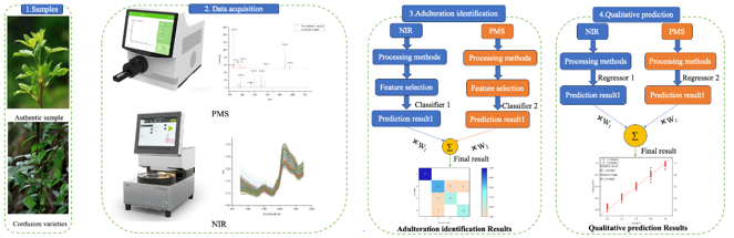 刺五加(Acanthopanax senticosus),又名西伯利亞人參,在中日韓及俄羅斯等國家被廣泛用于保健品和藥用制劑。由于其具有抗氧化、抗炎、增強免疫等多種藥理活性,在市場上需求旺盛,價格較高。然而,與其形態近似的易混淆品常被非法摻入,給中藥材市場帶來了嚴峻挑戰。為解決傳統色譜手段現場檢測耗時耗材、操作復雜的問題,研究團隊創新性地將便攜式質譜(PMS)與近紅外光譜(NIR)技術相結合,構建融合模型,從而實現對刺五加摻偽行為的快速識別與摻偽比例定量分析。