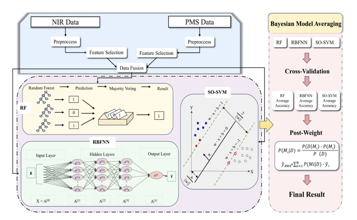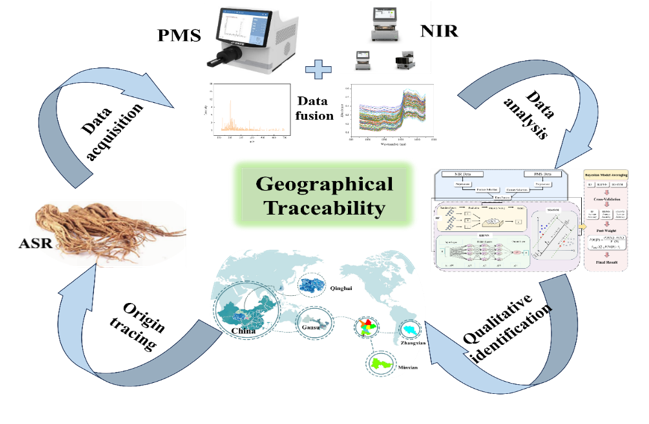 當歸作為傳統中藥中極具藥理價值的代表品種,不僅用于調和氣血、活血止痛,也被廣泛用于功能性食品和膳食補充劑。然而,不同產區的當歸在化學成分上存在顯著差異,其產地信息與質量效果也密切相關。傳統基于便攜式近紅外光譜(NIR)的方法雖具快速無損優勢,但因其光譜信息維度有限,且易受環境和樣本基線干擾,導致模型性能不穩定、準確率有限。為解決上述瓶頸問題,研究團隊首次引入便攜式質譜儀進行當歸道地性溯源研究(圖1)。該設備小巧輕便(約41.5×28.5×37 cm,重量<20 kg),內置脈沖直流電噴霧離子源,具備真正的現場快速檢測能力。團隊采用多層次數據融合策略,將PMS與NIR兩種互補性技術結合,構建穩健的融合模型,顯著提升了判別精度與模型泛化能力。研究結果表明,該高級融合模型(圖2)在多產區當歸樣品中的識別準確率達到96%以上,遠優于傳統單一近紅外光譜模型,具備極強的現場應用潛力和推廣價值。